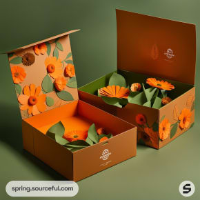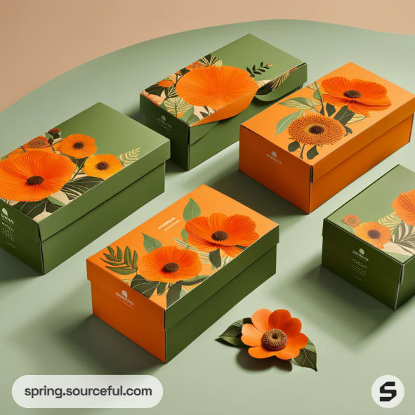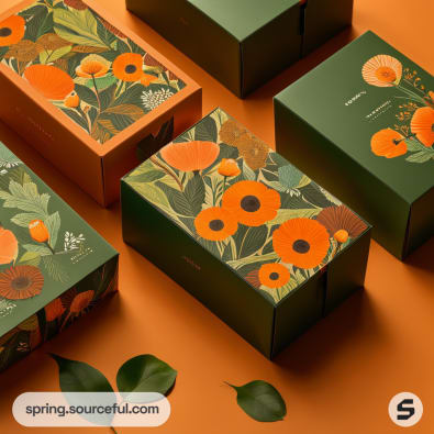 Green and orange floral-themed packaging boxes with leaf and flower designs on a green surface.