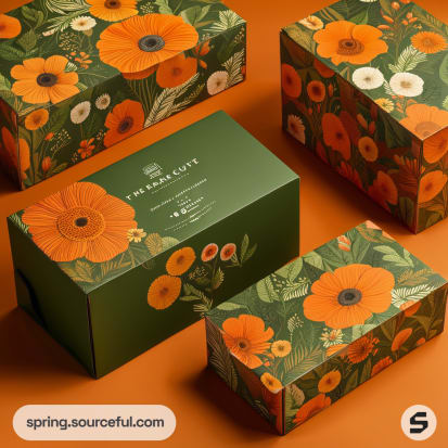 Floral-patterned packaging boxes with orange and green design on an orange background.