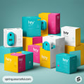Colorful boxes in teal, yellow, pink, and white with geometric patterns on a blue surface.
