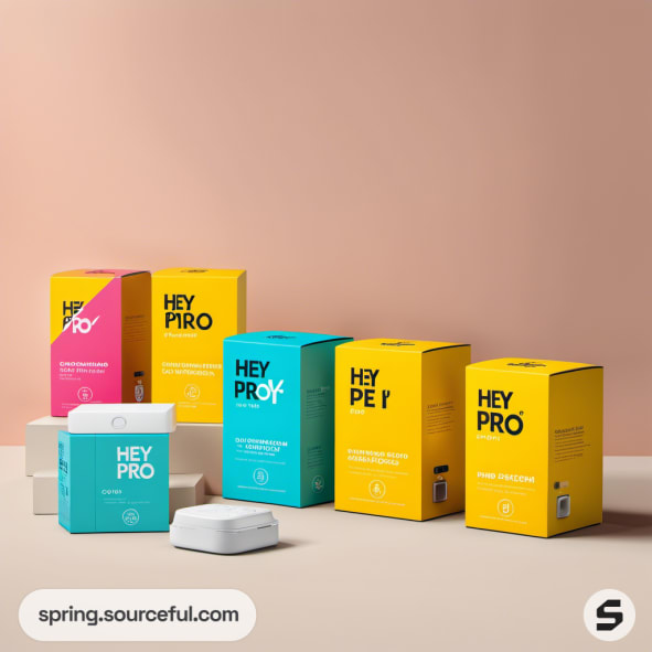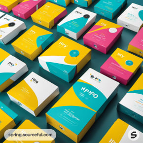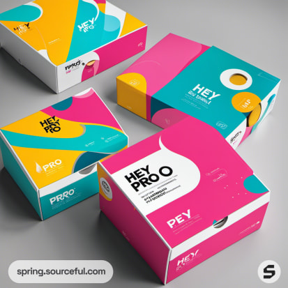 Boxes with vibrant pink, teal, and yellow designs on a gray surface.