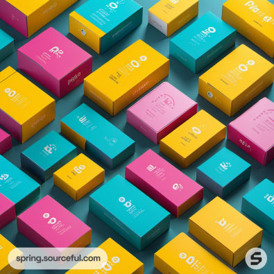 An array of boxes in yellow, teal, and pink with various sizes and designs on a blue background.