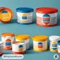 Round containers with colorful lids and minimal patterns on teal background.
