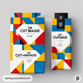 Bold geometric box packaging with red, blue, and yellow patterns.