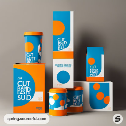Assorted colorful food packaging on teal background with abstract designs.