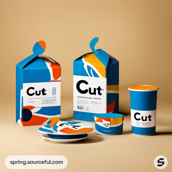 Colorful carton and cup packaging with abstract design and 'Cut' branding.