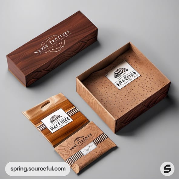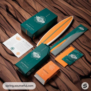 Multiple packaging pieces including a green box, orange packaging, and a mini surfboard on a wood grain background.