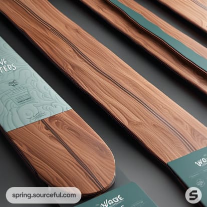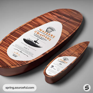 Oval and boat-shaped wood-patterned packages with white labels, featuring surfboard imagery and elegant typography.