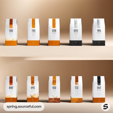 Two rows of white coffee bags with brown and black accents, displayed on a beige background.