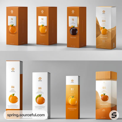 Orange-themed rectangular boxes featuring large fruit images on white and orange backgrounds.