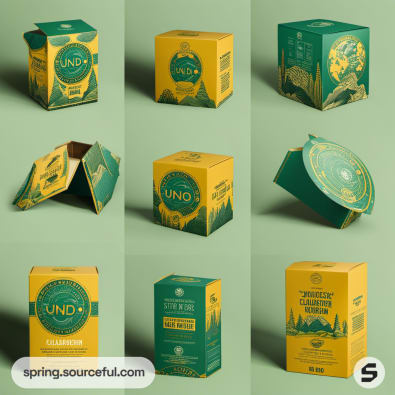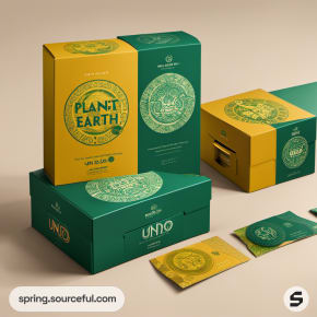 Assorted green and yellow packaging with botanical themes.