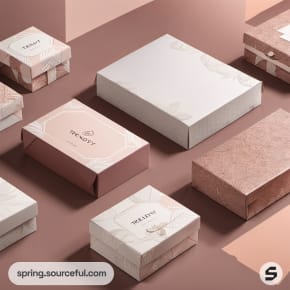 Elegant gift boxes in various pink and beige tones with floral patterns.