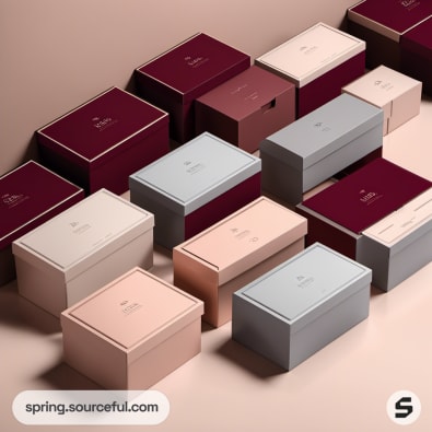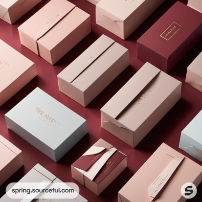 Variety of pink, maroon, and beige gift boxes neatly arranged.