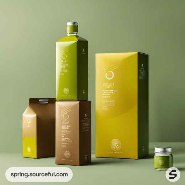 Tall boxes and cups with green, white, and brown design on brown surface.