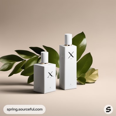 Two white perfume bottles with botanical accents on a backdrop of green leaves.