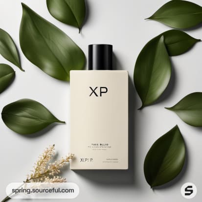 Cream colored perfume bottle with black cap surrounded by green leaves.