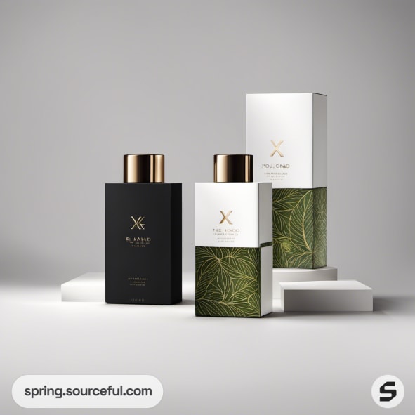 Cream boxes with subtle design; one has a black cap bottle, one is sealed.