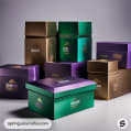 Assorted green and purple rectangular boxes with gold details on a gray background.