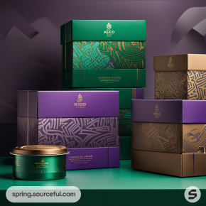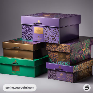 Stacked luxury gift boxes in purple, green, and gold with geometric patterns.