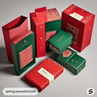 Pastel green and pink gift boxes with rose designs and ribbons.