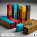 Tall boxes with geometric designs in red, teal, and gold.
