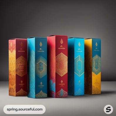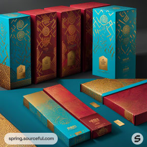 Elegant rectangular boxes in teal and red with gold geometric designs and hexagonal labels.