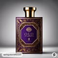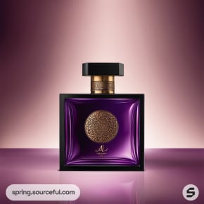 Square purple perfume bottle with gold detailing on a purple gradient background.