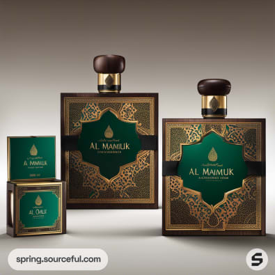 Two elegant perfume bottles with green and gold design, accompanied by smaller boxes.