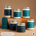 Assorted cylindrical tins in white, orange, and teal with minimalistic design, arranged on pedestals.