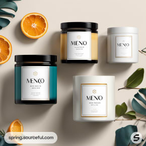 Flatlay of four candles in teal, black, and white glass jars surrounded by orange slices and green leaves.