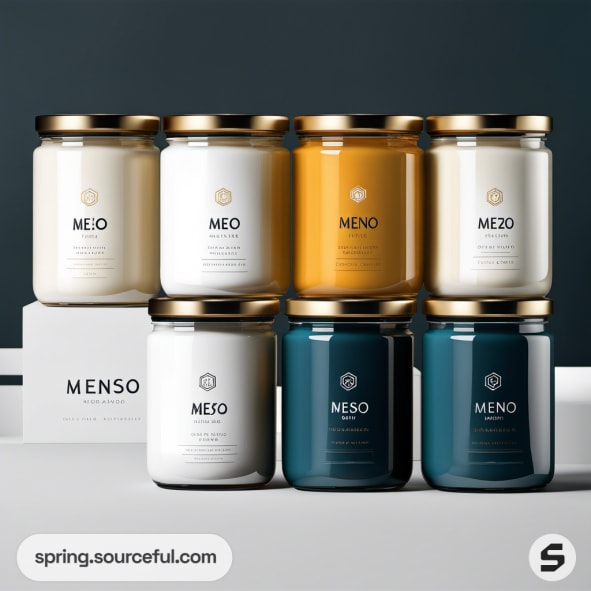 Seven glass jars with gold lids in white, mustard, teal colors, featuring elegant labels set against a dark background.
