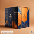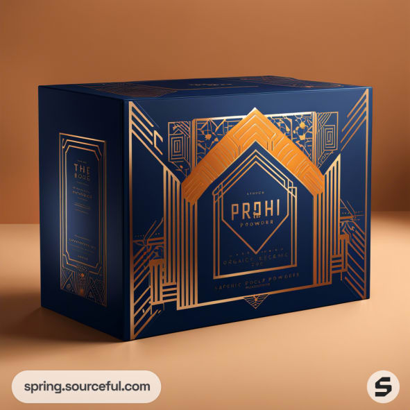 Elegant navy and orange packaging box with geometric gold patterns and minimalistic design.