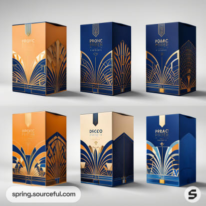 Art Deco inspired packaging with blue and orange geometric designs on tall boxes.