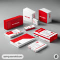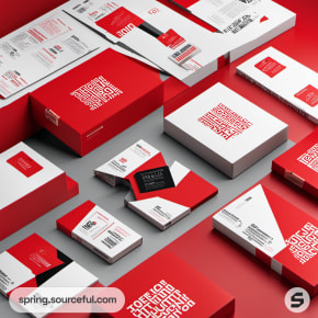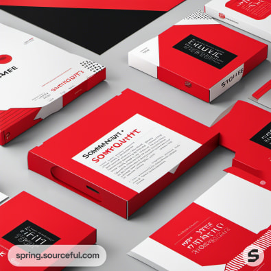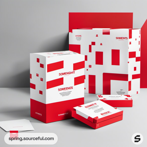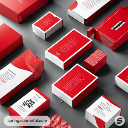 Red and white packaging designs with geometric patterns on mailer boxes.