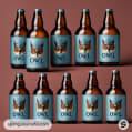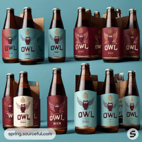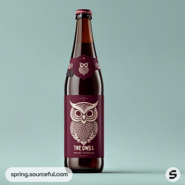 Brown glass bottle with owl illustration on burgundy label, teal background.