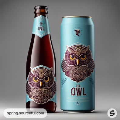 Glass bottle and can with owl illustrations, teal and gray color scheme.