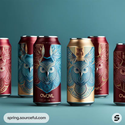 Assorted cans with owl designs, in blue, gold, and red colors.