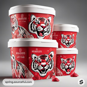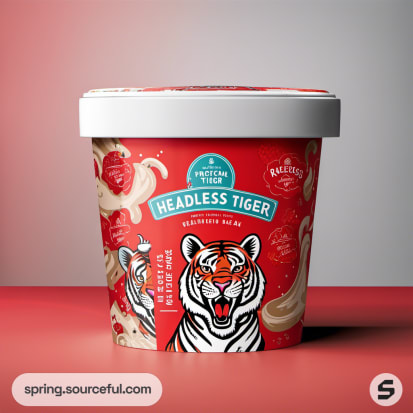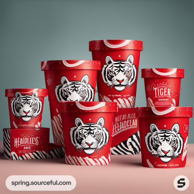 Ice cream tubs stacked with fierce tiger designs on red packaging.