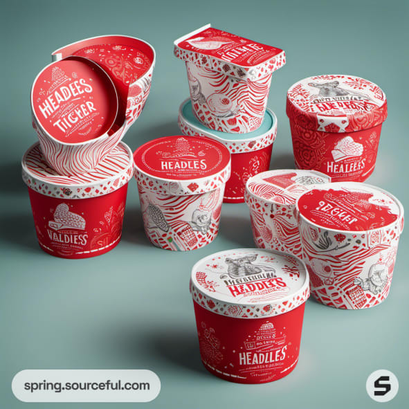 Ice cream tubs and boxes with red tiger graphics and strawberries.