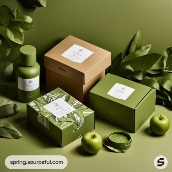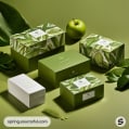 Eco-friendly packaging with green apple design featuring boxes and containers on a green background.
