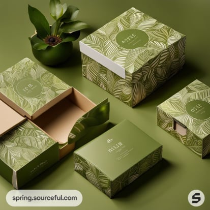 Green and beige gift boxes with leaf patterns and round seals on a light background.