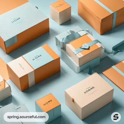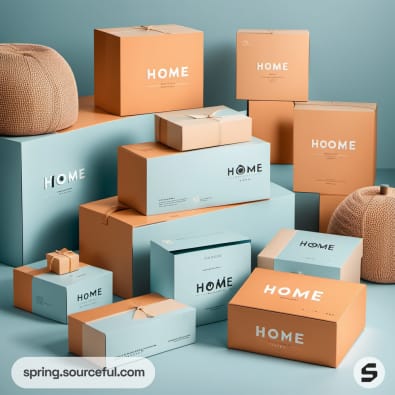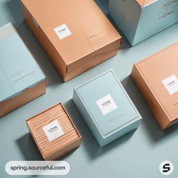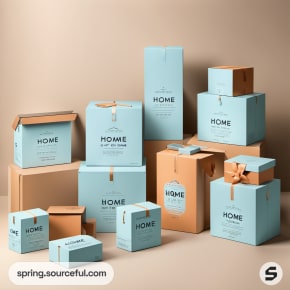 Discover the latest trends in homeware packaging with our chic and modern shipping boxes. Our boxes, in a delightful color scheme of baby blue, apricot, and aquamarine, add a fun and cute aesthetic to your products. Enhance your brand's appeal with our unique packaging inspiration that perfectly complements your homeware items. Make your product delivery an exciting experience for your customers with our stylish and contemporary packaging designs.