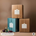 Three wine boxes in teal and beige with a glass of red wine and grapes displayed on a wooden surface.