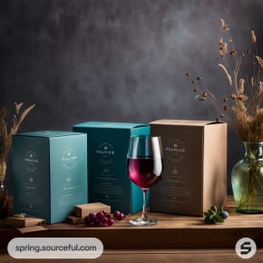 Four teal and brown wine boxes with a glass of red wine and grapes in rustic setting.