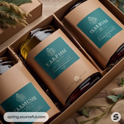 Three glass bottles in a cardboard holder with teal labels and brown packaging, surrounded by leaves and twigs.