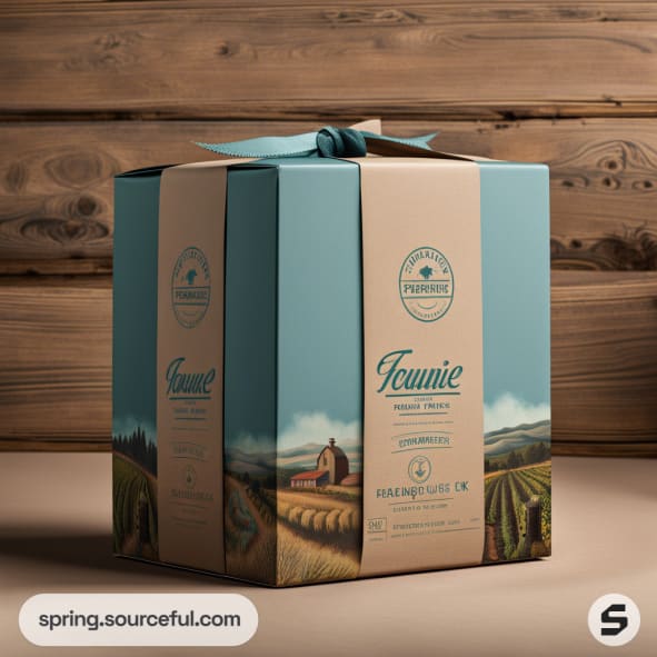 Farm-themed cardboard gift box with ribbon, featuring nature illustrations and text, set against a wooden background.