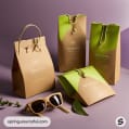 Elegant brown and green paper bags with handles on a neutral background.