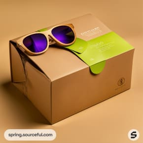 Brown box with green label and purple-lensed sunglasses on top.