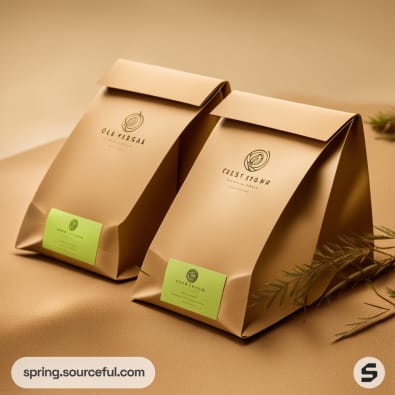 Two brown kraft paper bags with green labels on a beige background.