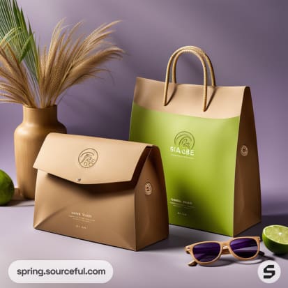 Brown and green paper bags with branded design, placed next to a vase and sunglasses.