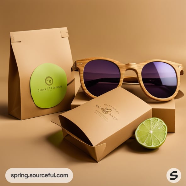 Brown cardboard packaging with wooden sunglasses and a lime half on a beige background.
